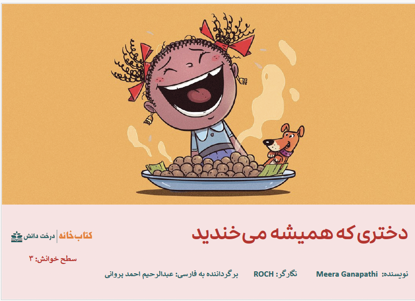 دختری که همیشه میخندید، داستان جالبی در مورد دختریست که همیشه میخندد. ﭘﺮوﯾﻦ ﻫﺮ روز ﺑﻪ ﺧﺎﻃﺮ ﺧﻨﺪهﻫﺎﯾﺶ دﭼﺎر ﻣﺸﮑﻞ ﻣﯽﺷﻮد. ﺗﻘﺮﯾﺒﺎً ً ًﻫﺮ ﭼﯿﺰ او را ﺑﻪ ﺧﻨﺪه ﻣﯽآورد. او ﻧﻤﯽﺗﻮاﻧﺪ دﻫﺎﻧﺶ را ﺑﺒﻨﺪد. ﭘﺮوﯾﻦ ﻣﯽﺧﻮاﻫﺪ ﺑﺪاﻧﺪ آﯾﺎ خندیدن یک بیماریست؟ آیا او ﺑﯿﻤﺎر است؟ زﯾﺮا او ﻣﯽﺧﻮاﻫﺪ خندیدن کدام ﺑﯿﻤﺎری ﻧﺒﺎﺷﺪ ﺗﺎ او ﺑﺘﻮاﻧﺪ ﺑﺨﻨﺪد و ﺑﺨﻨﺪد. این داستان را عبدالرحیم احمد پروانی از زبان انگلیسی به فارسی برگردانده است.